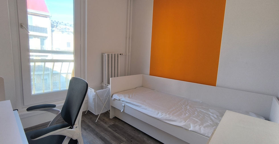 This cute little orange room is small, but it has a faux balcony and everything you need for a comfy stay. It's nicely tucked away from the rest of the apartment and gets plenty of sunlight.